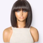 Put On and Go Realistic Glueless Yaki Straight Bob with Bangs Minimalist Lace Wig 100% Human Hair